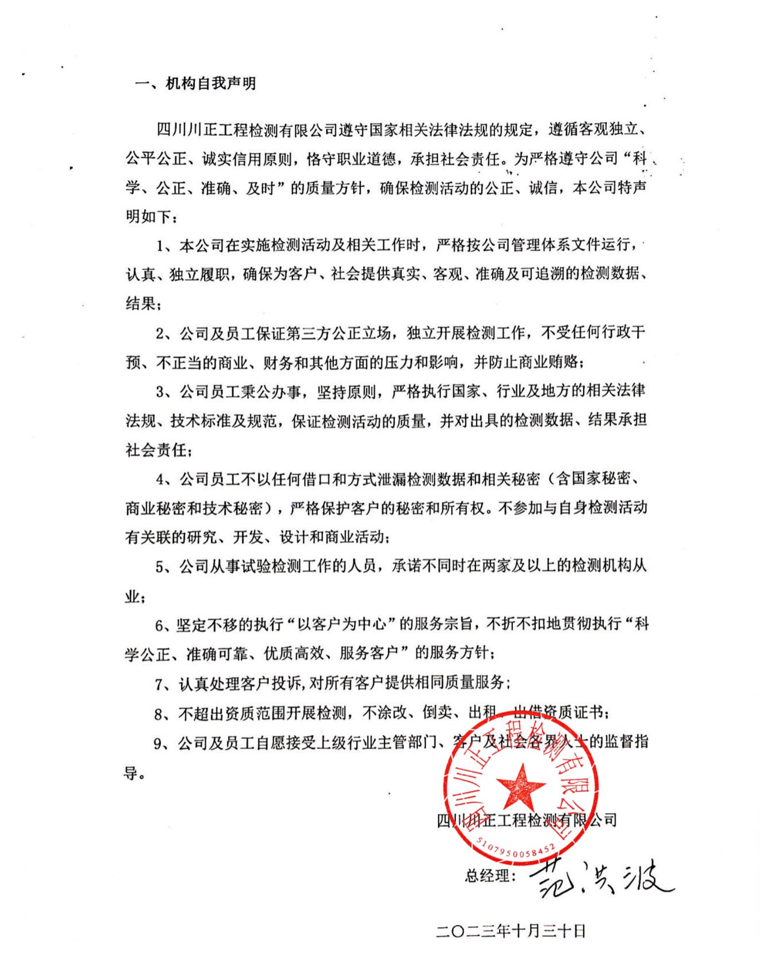 四川川正工程检测有限公司自我声明